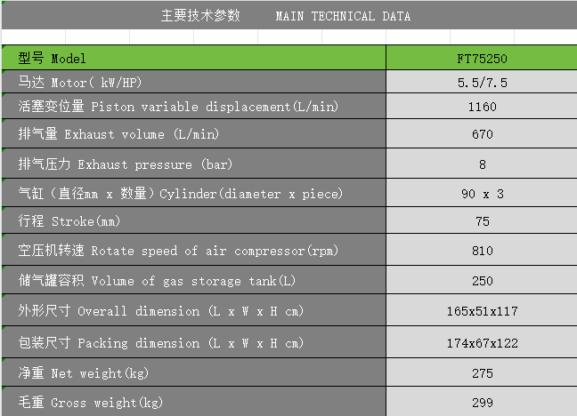 標題:FT75250 新型節能環保活塞空壓機 5.5kW/7.5HP