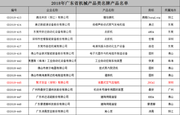 喜訊——根據(jù)《廣東省名牌產(chǎn)品評價指南》標(biāo)準(zhǔn)要求,在企業(yè)自愿申報的基礎(chǔ)上,經(jīng)申報資料初審、審報數(shù)據(jù)公示、企業(yè)現(xiàn)場審查、專家綜合評價、廣東質(zhì)量品牌評審專家委員會審議確認(rèn),授予聚才實業(yè)(深圳)有限公司生產(chǎn)的“JUCAI聚才”牌活塞式空氣壓縮機(jī)等系列產(chǎn)品為2018年度廣東省行業(yè)類名牌,有效期三年。
